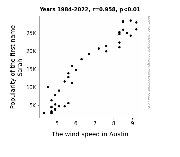 This means 91.8% of the change in the one variable (i.e., The wind speed in Austin) is predictable based on the change in the other (i.e., Popularity of the first name Sarah) over the 39 years from 1984 through 2022.