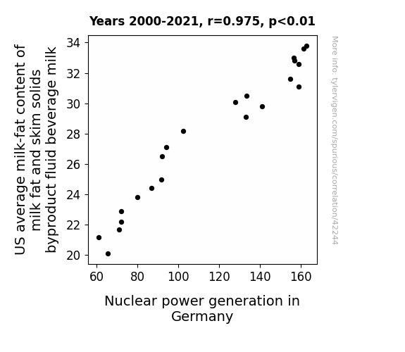 This means 95.1% of the change in the one variable (i.e., Nuclear power generation in Germany) is predictable based on the change in the other (i.e., US average milk-fat content of milk fat and skim solids byproduct fluid beverage milk) over the 22 years from 2000 through 2021.