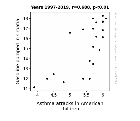 This means 47.3% of the change in the one variable (i.e., Asthma attacks in American children) is predictable based on the change in the other (i.e., Gasoline pumped in Croatia) over the 23 years from 1997 through 2019.