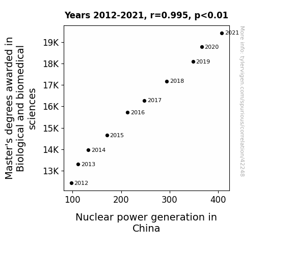 This means 98.9% of the change in the one variable (i.e., Nuclear power generation in China) is predictable based on the change in the other (i.e., Master's degrees awarded in Biological and biomedical sciences) over the 10 years from 2012 through 2021.
