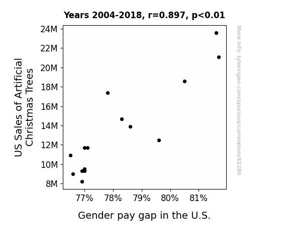 This means 80.5% of the change in the one variable (i.e., Gender pay gap in the U.S.) is predictable based on the change in the other (i.e., US Sales of Artificial Christmas Trees) over the 15 years from 2004 through 2018.