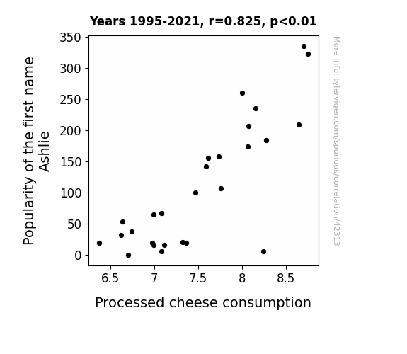 This means 68.1% of the change in the one variable (i.e., Processed cheese consumption) is predictable based on the change in the other (i.e., Popularity of the first name Ashlie) over the 27 years from 1995 through 2021.