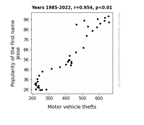 This means 91% of the change in the one variable (i.e., Motor vehicle thefts) is predictable based on the change in the other (i.e., Popularity of the first name Jesse) over the 38 years from 1985 through 2022.