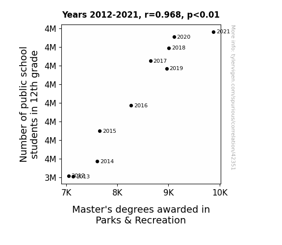 This means 93.7% of the change in the one variable (i.e., Master's degrees awarded in Parks & Recreation) is predictable based on the change in the other (i.e., Number of public school students in 12th grade) over the 10 years from 2012 through 2021.