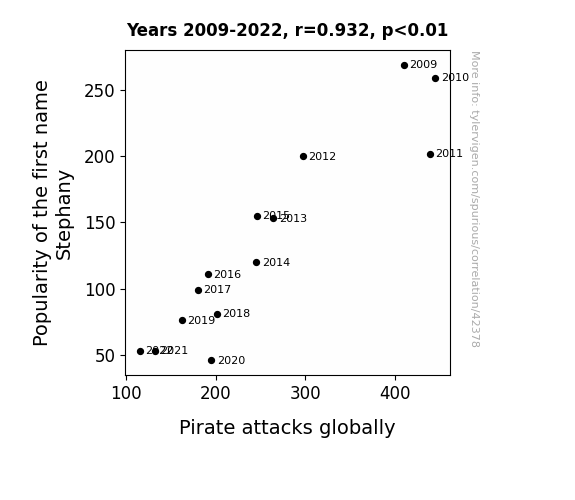 This means 86.9% of the change in the one variable (i.e., Pirate attacks globally) is predictable based on the change in the other (i.e., Popularity of the first name Stephany) over the 14 years from 2009 through 2022.