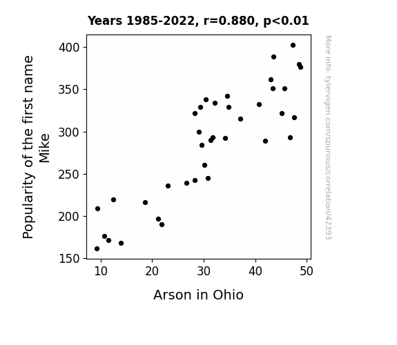 This means 77.4% of the change in the one variable (i.e., Arson in Ohio) is predictable based on the change in the other (i.e., Popularity of the first name Mike) over the 38 years from 1985 through 2022.