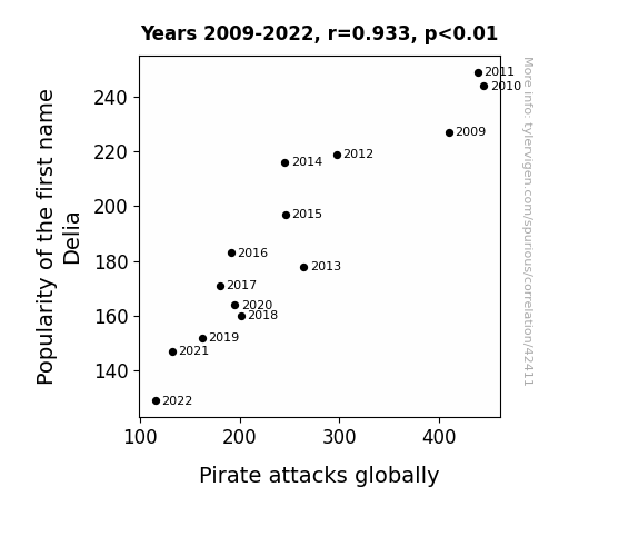 This means 87.1% of the change in the one variable (i.e., Pirate attacks globally) is predictable based on the change in the other (i.e., Popularity of the first name Delia) over the 14 years from 2009 through 2022.