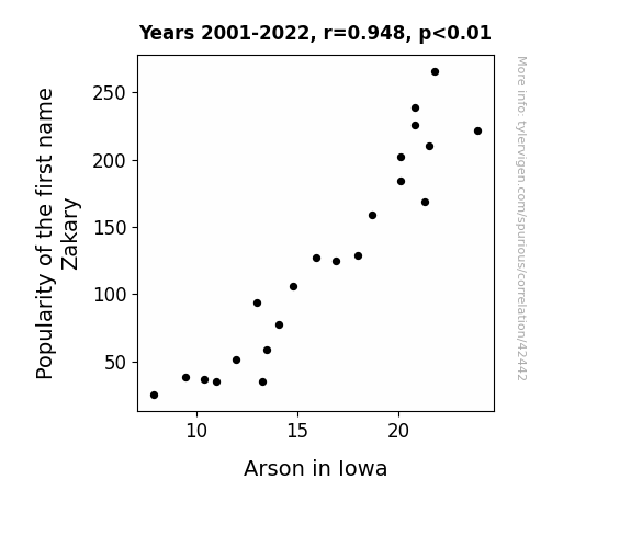 This means 89.9% of the change in the one variable (i.e., Arson in Iowa) is predictable based on the change in the other (i.e., Popularity of the first name Zakary) over the 22 years from 2001 through 2022.