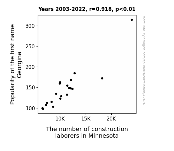 This means 84.3% of the change in the one variable (i.e., The number of construction laborers in Minnesota) is predictable based on the change in the other (i.e., Popularity of the first name Georgina) over the 20 years from 2003 through 2022.