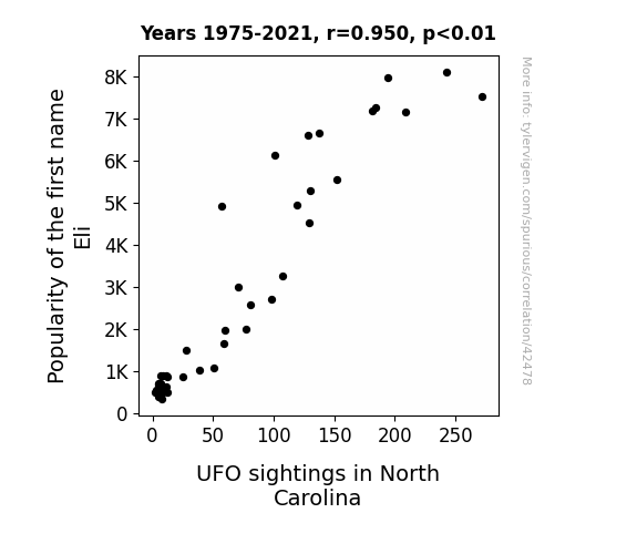 This means 90.3% of the change in the one variable (i.e., UFO sightings in North Carolina) is predictable based on the change in the other (i.e., Popularity of the first name Eli) over the 47 years from 1975 through 2021.