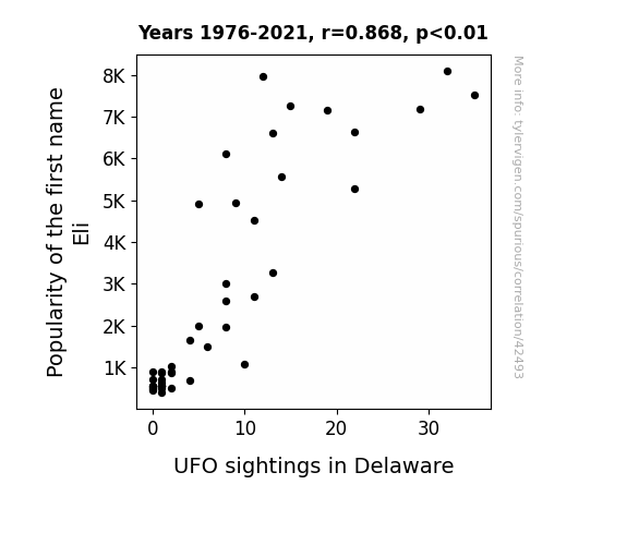 This means 75.3% of the change in the one variable (i.e., UFO sightings in Delaware) is predictable based on the change in the other (i.e., Popularity of the first name Eli) over the 46 years from 1976 through 2021.