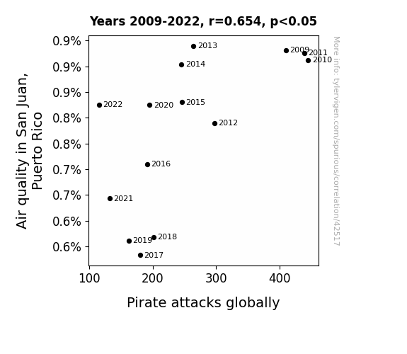 This means 42.8% of the change in the one variable (i.e., Pirate attacks globally) is predictable based on the change in the other (i.e., Air quality in San Juan, Puerto Rico) over the 14 years from 2009 through 2022.