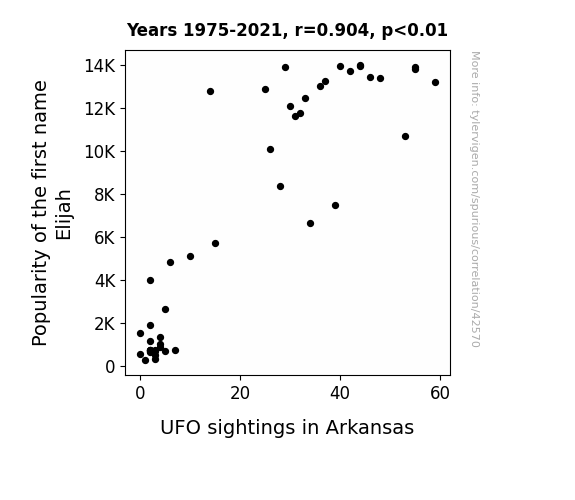 This means 81.8% of the change in the one variable (i.e., UFO sightings in Arkansas) is predictable based on the change in the other (i.e., Popularity of the first name Elijah) over the 47 years from 1975 through 2021.