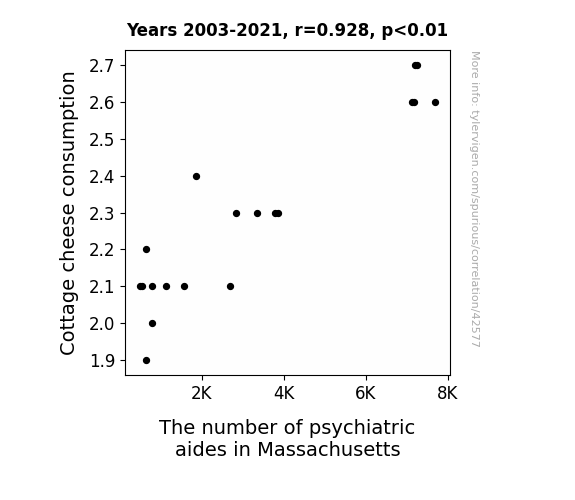 This means 86.2% of the change in the one variable (i.e., The number of psychiatric aides in Massachusetts) is predictable based on the change in the other (i.e., Cottage cheese consumption) over the 19 years from 2003 through 2021.