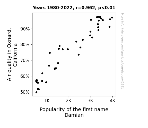 This means 92.6% of the change in the one variable (i.e., Popularity of the first name Damian) is predictable based on the change in the other (i.e., Air quality in Oxnard, California) over the 43 years from 1980 through 2022.