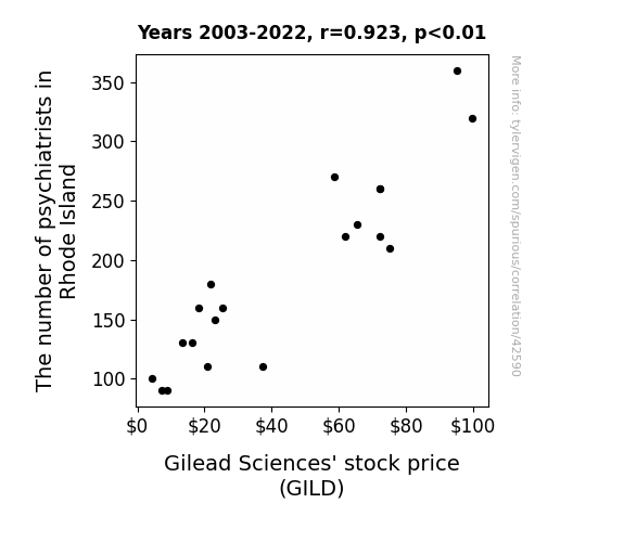 This means 85.2% of the change in the one variable (i.e., Gilead Sciences' stock price (GILD)) is predictable based on the change in the other (i.e., The number of psychiatrists in Rhode Island) over the 20 years from 2003 through 2022.