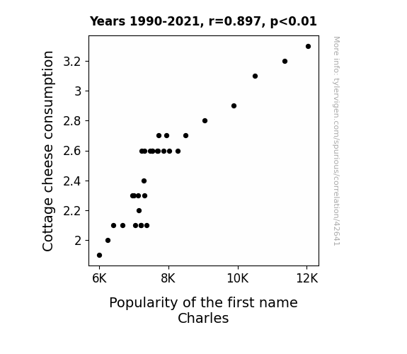 This means 80.5% of the change in the one variable (i.e., Popularity of the first name Charles) is predictable based on the change in the other (i.e., Cottage cheese consumption) over the 32 years from 1990 through 2021.