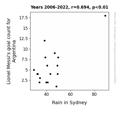 This means 48.2% of the change in the one variable (i.e., Rain in Sydney) is predictable based on the change in the other (i.e., Lionel Messi's goal count for Argentina) over the 17 years from 2006 through 2022.