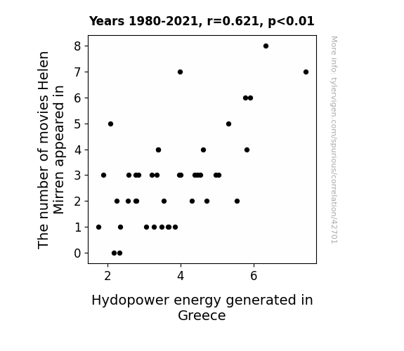 This means 38.5% of the change in the one variable (i.e., Hydopower energy generated in Greece) is predictable based on the change in the other (i.e., The number of movies Helen Mirren appeared in) over the 42 years from 1980 through 2021.