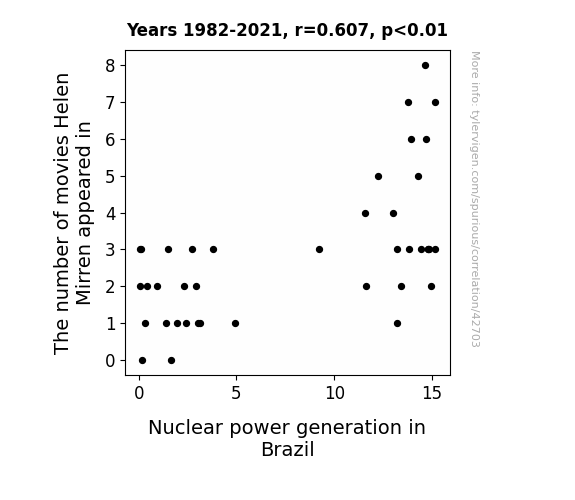 This means 36.9% of the change in the one variable (i.e., Nuclear power generation in Brazil) is predictable based on the change in the other (i.e., The number of movies Helen Mirren appeared in) over the 40 years from 1982 through 2021.