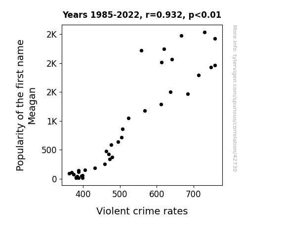 This means 86.9% of the change in the one variable (i.e., Violent crime rates) is predictable based on the change in the other (i.e., Popularity of the first name Meagan) over the 38 years from 1985 through 2022.