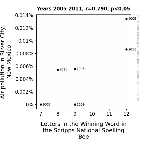 This means 62.5% of the change in the one variable (i.e., Letters in the Winning Word in the Scripps National Spelling Bee) is predictable based on the change in the other (i.e., Air pollution in Silver City, New Mexico) over the 7 years from 2005 through 2011.