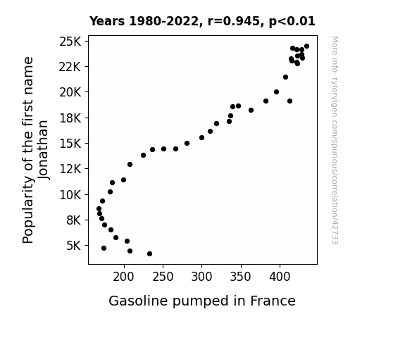 This means 89.4% of the change in the one variable (i.e., Gasoline pumped in France) is predictable based on the change in the other (i.e., Popularity of the first name Jonathan) over the 43 years from 1980 through 2022.