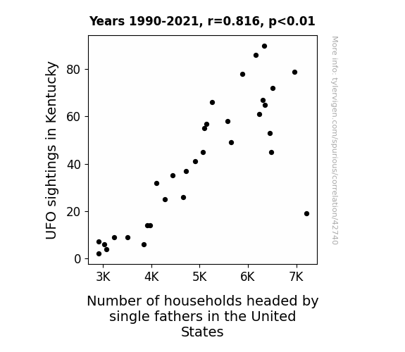 This means 66.7% of the change in the one variable (i.e., Number of households headed by single fathers in the United States) is predictable based on the change in the other (i.e., UFO sightings in Kentucky) over the 32 years from 1990 through 2021.