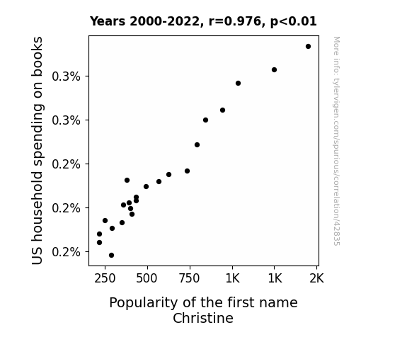 This means 95.2% of the change in the one variable (i.e., Popularity of the first name Christine) is predictable based on the change in the other (i.e., US household spending on books) over the 23 years from 2000 through 2022.