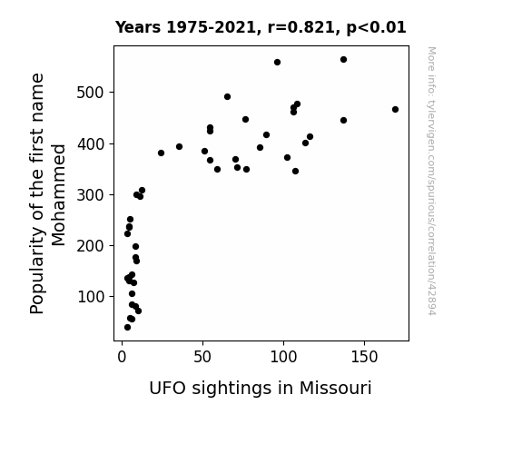 This means 67.4% of the change in the one variable (i.e., UFO sightings in Missouri) is predictable based on the change in the other (i.e., Popularity of the first name Mohammed) over the 47 years from 1975 through 2021.