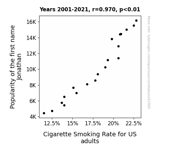 This means 94% of the change in the one variable (i.e., Cigarette Smoking Rate for US adults) is predictable based on the change in the other (i.e., Popularity of the first name Jonathan) over the 21 years from 2001 through 2021.