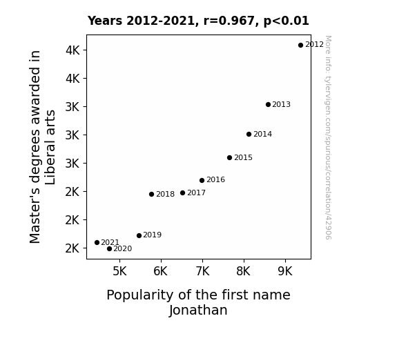 This means 93.5% of the change in the one variable (i.e., Popularity of the first name Jonathan) is predictable based on the change in the other (i.e., Master's degrees awarded in Liberal arts) over the 10 years from 2012 through 2021.