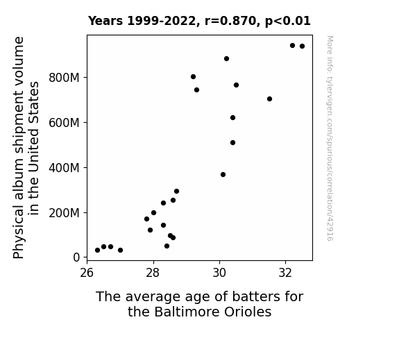 This means 75.7% of the change in the one variable (i.e., The average age of batters for the Baltimore Orioles) is predictable based on the change in the other (i.e., Physical album shipment volume in the United States) over the 24 years from 1999 through 2022.