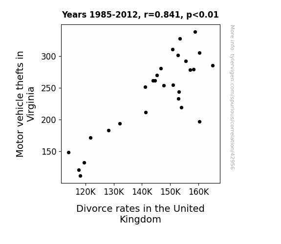 This means 70.7% of the change in the one variable (i.e., Divorce rates in the United Kingdom) is predictable based on the change in the other (i.e., Motor vehicle thefts in Virginia) over the 28 years from 1985 through 2012.