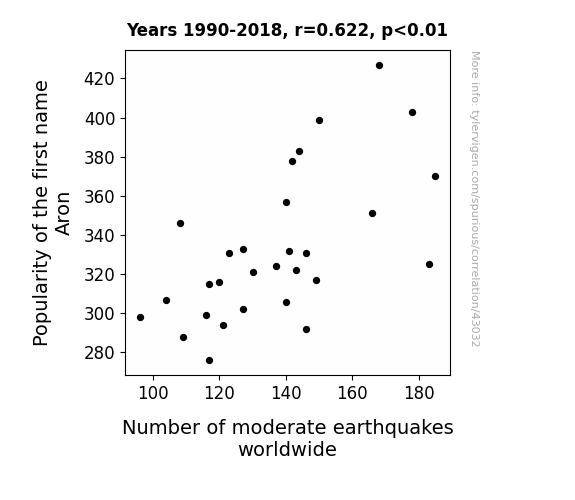 This means 38.6% of the change in the one variable (i.e., Number of moderate earthquakes worldwide) is predictable based on the change in the other (i.e., Popularity of the first name Aron) over the 29 years from 1990 through 2018.