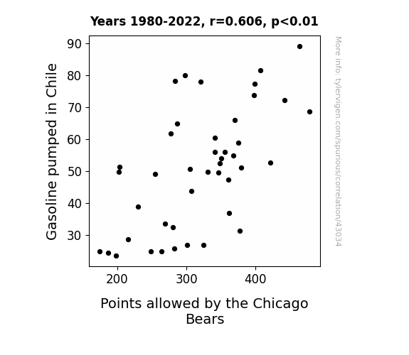 This means 36.7% of the change in the one variable (i.e., Points allowed by the Chicago Bears) is predictable based on the change in the other (i.e., Gasoline pumped in Chile) over the 43 years from 1980 through 2022.