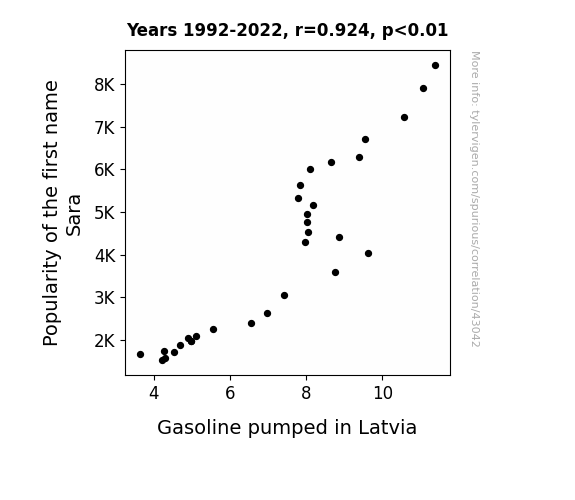 This means 85.3% of the change in the one variable (i.e., Gasoline pumped in Latvia) is predictable based on the change in the other (i.e., Popularity of the first name Sara) over the 31 years from 1992 through 2022.