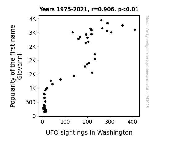 This means 82.1% of the change in the one variable (i.e., UFO sightings in Washington) is predictable based on the change in the other (i.e., Popularity of the first name Giovanni) over the 47 years from 1975 through 2021.