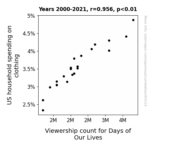 This means 91.4% of the change in the one variable (i.e., Viewership count for Days of Our Lives) is predictable based on the change in the other (i.e., US household spending on clothing) over the 22 years from 2000 through 2021.