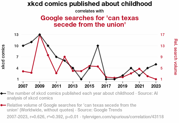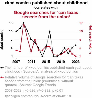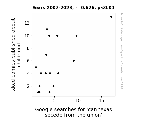 This means 39.2% of the change in the one variable (i.e., Google searches for 'can texas secede from the union') is predictable based on the change in the other (i.e., xkcd comics published about childhood) over the 17 years from 2007 through 2023.