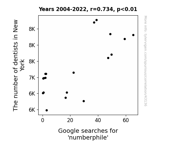 This means 53.9% of the change in the one variable (i.e., Google searches for 'numberphile') is predictable based on the change in the other (i.e., The number of dentists in New York) over the 19 years from 2004 through 2022.