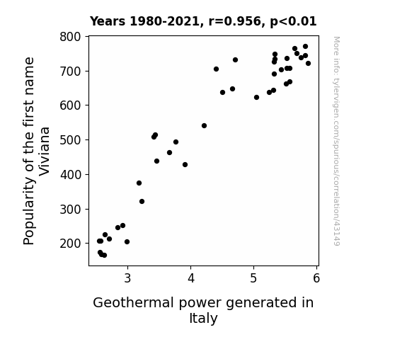 This means 91.4% of the change in the one variable (i.e., Geothermal power generated in Italy) is predictable based on the change in the other (i.e., Popularity of the first name Viviana) over the 42 years from 1980 through 2021.