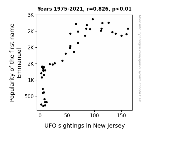 This means 68.3% of the change in the one variable (i.e., UFO sightings in New Jersey) is predictable based on the change in the other (i.e., Popularity of the first name Emmanuel) over the 47 years from 1975 through 2021.