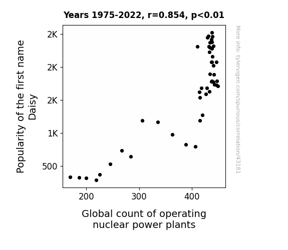 This means 73% of the change in the one variable (i.e., Global count of operating nuclear power plants) is predictable based on the change in the other (i.e., Popularity of the first name Daisy) over the 48 years from 1975 through 2022.