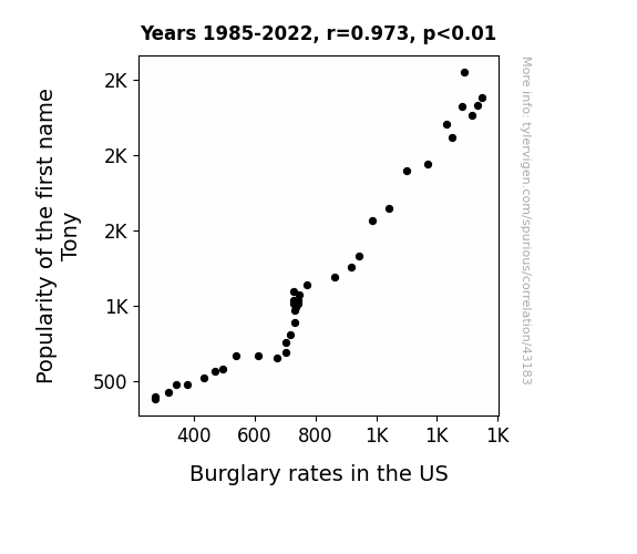 This means 94.6% of the change in the one variable (i.e., Burglary rates in the US) is predictable based on the change in the other (i.e., Popularity of the first name Tony) over the 38 years from 1985 through 2022.