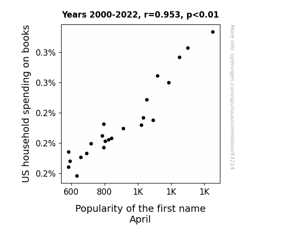 This means 90.8% of the change in the one variable (i.e., Popularity of the first name April) is predictable based on the change in the other (i.e., US household spending on books) over the 23 years from 2000 through 2022.