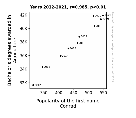 This means 97.1% of the change in the one variable (i.e., Popularity of the first name Conrad) is predictable based on the change in the other (i.e., Bachelor's degrees awarded in Agriculture) over the 10 years from 2012 through 2021.