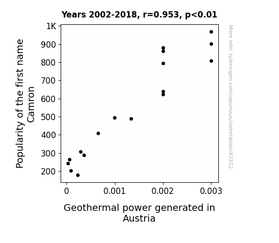 This means 90.8% of the change in the one variable (i.e., Geothermal power generated in Austria) is predictable based on the change in the other (i.e., Popularity of the first name Camron) over the 17 years from 2002 through 2018.