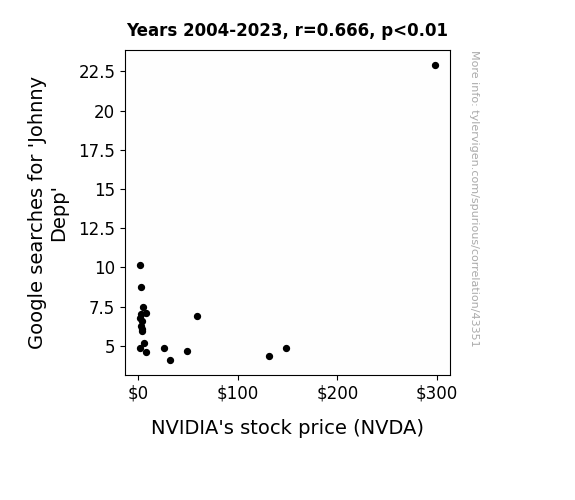 This means 44.4% of the change in the one variable (i.e., NVIDIA's stock price (NVDA)) is predictable based on the change in the other (i.e., Google searches for 'Johnny Depp') over the 20 years from 2004 through 2023.