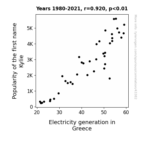This means 84.7% of the change in the one variable (i.e., Electricity generation in Greece) is predictable based on the change in the other (i.e., Popularity of the first name Kylie) over the 42 years from 1980 through 2021.